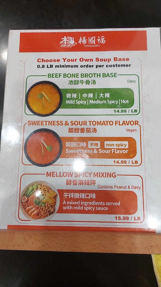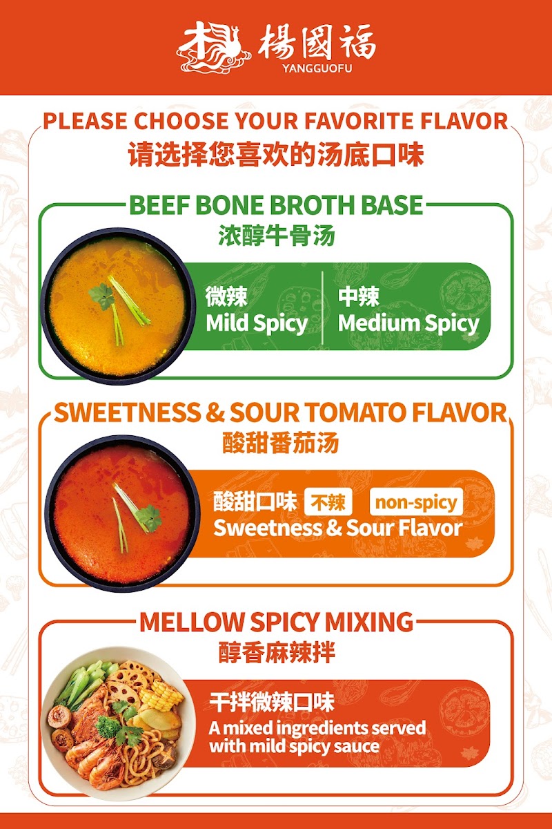 The menu at YGF Malatang offers a straightforward, customizable dining experience centered around flavorful Chinese hot pot-style dishes. Guests typically select a soup base—such as the rich Signature Beef Broth or the vibrant Tomato Soup—then fill their bowls with an assortment of fresh vegetables, meats, noodles, and tofu. This simple, hands-on approach makes it easy to enjoy a meal tailored to your preferences, whether you lean toward mild and comforting or bold and spicy flavors.